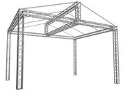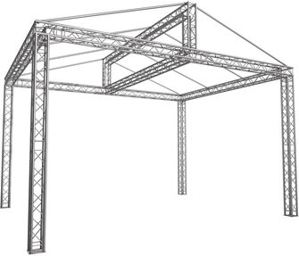 Dieses Bühnen-Giebeldach aus Naxpro-Truss FD 34 Traversen stellt beispielhaft eine von unzähligen Konstruktionsmöglichkeiten dar, die im Bühnenbau mit Standard-Bauteilen von Naxpro-Truss leicht und kostengünstig zu realisieren sind.