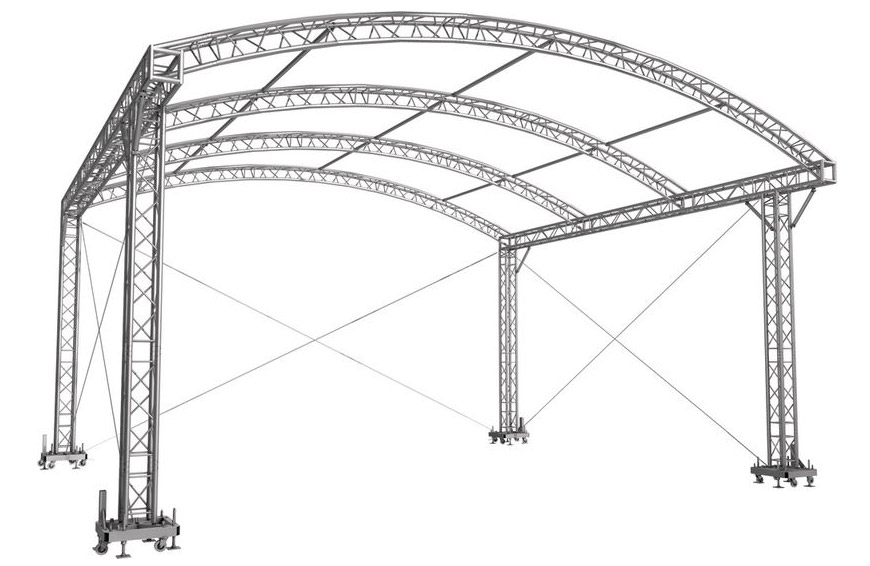 Dieses Bühnen-Rundbogendach aus Naxpro-Truss FD 34 Traversen stellt beispielhaft eine von unzähligen Konstruktionsmöglichkeiten dar, die im Bühnenbau mit Standard-Bauteilen von Naxpro-Truss leicht und kostengünstig zu realisieren sind.